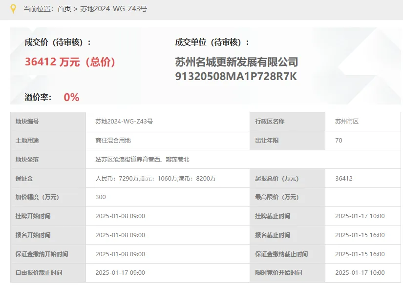姑苏区43号地块项目,即, 苏地2024-WG-Z43号,位于姑苏区沧浪街道养育巷西、瓣莲巷北,是1月17日,苏州名城更新发展有限公司以底价36412万元竞得,成交楼面价28708元/平。