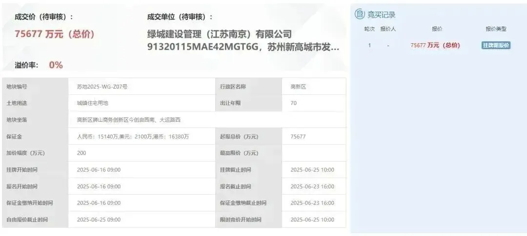 绿城&苏高新狮山7号地块项目,即,苏地2025-WG-Z07号地块,位于高新区狮山商务创新区今创启园南、大运路西,是6月25日,绿城&苏高新以底价75677万元竞得,成交楼面价20500元/平。