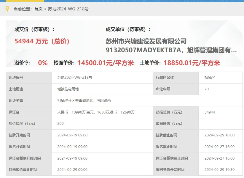 旭辉元和18号地块项目,即,苏地2024-WG-Z18号地块,位于相城经开区春申湖路北、澄阳路西,是2024年6月19日,旭辉&兴塘建设发展以底价54944万元竞得,成交楼面价14500元/平。