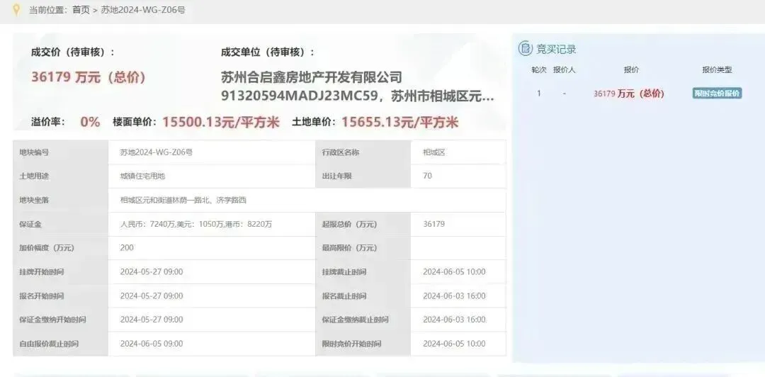 苏州合启鑫&元和重建6号地块,即位于相城区元和街道林荫一路北、济学路西,是2024年6月5日,苏州合启鑫&元和重建以底价36179万元竞得,成交楼面价15655元/平。