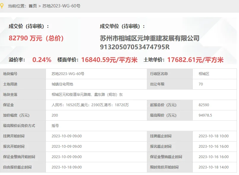 元坤重建60号地块项目,即,苏地2023-WG-60号地块,位于相城区元和街道华元路南、蠡东路(规划)东,是2023年10月18日,元坤重建以总价82790万元竞得,成交楼面价16841元/平,溢价率0.24%。