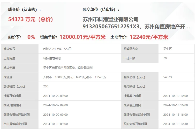 斜港置业&甪直房地产甪直23号地块项目,即,苏地2024-WG-Z23号地块项目,位于吴中区甪直镇甫澄路西侧、南沙路南侧,是203年10月18日,斜港置业&甪直房地产以底价54373万元竞得,成交楼面价12000元/平。