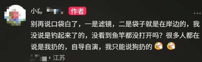一拨是“剧本派”,斩钉截铁:“我孙子也爱这么玩,自己埋自己挖!”“一看就是自导自演,流量密码算是玩明白了。”钓友也挺委屈,在评论区怼了回去:“狗扔的行了吧!”