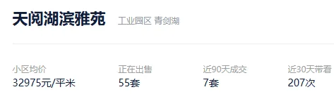 根据贝壳信息显示,天阅湖滨雅苑目前55套挂牌出售,挂牌均价32975元/平。