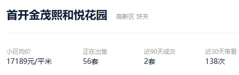 根据贝壳数据显示,今年以来,该社区成交了1套二手住房,套均成交面积114.05平,平均挂牌单套总价198万元,挂牌单价17361元/平,平均成交周期56天。