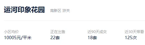 根据贝壳数据显示,今年以来,该社区成交了1套二手住房,套均成交面积125.39平,平均挂牌单套总价268万元,挂牌单价21373元/平,平均成交周期78天。