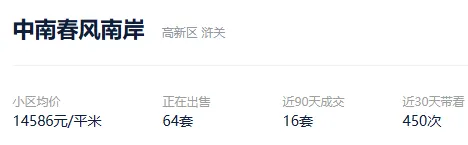 根据贝壳信息显示,中南春风南岸目前64套挂牌出售,挂牌均价14586元/平。