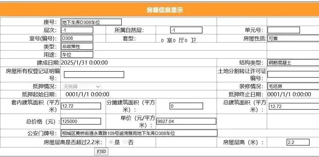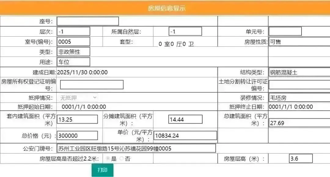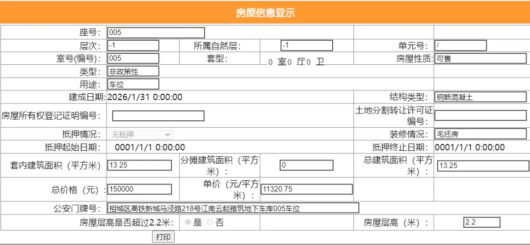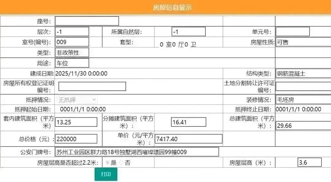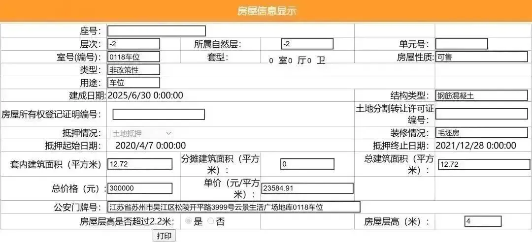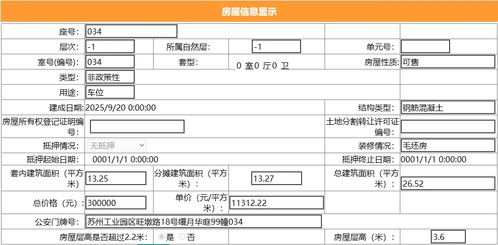 其车位总建筑面积26.52平,套内建筑面积13.25平,备案均价11312.22元/平,备案总价30万元。