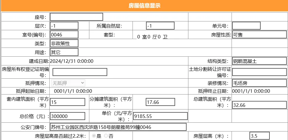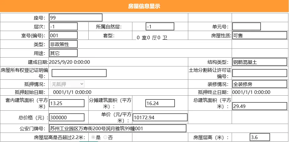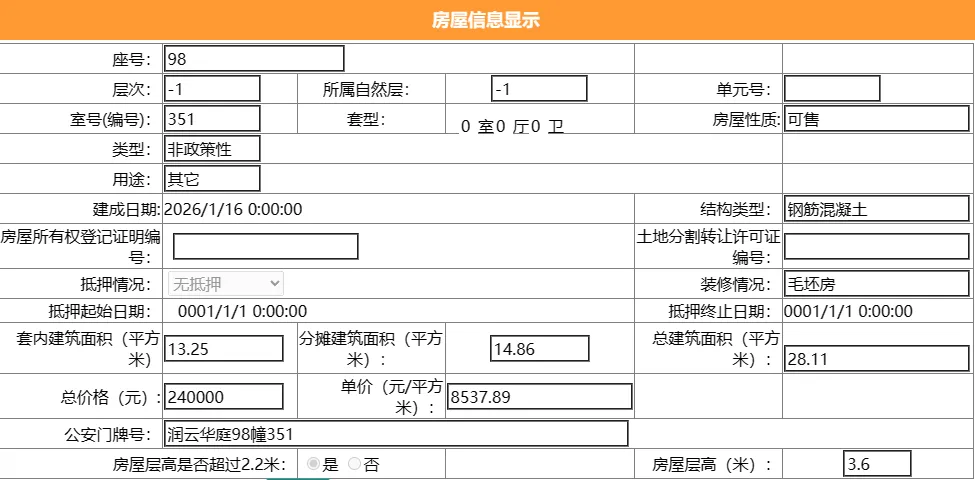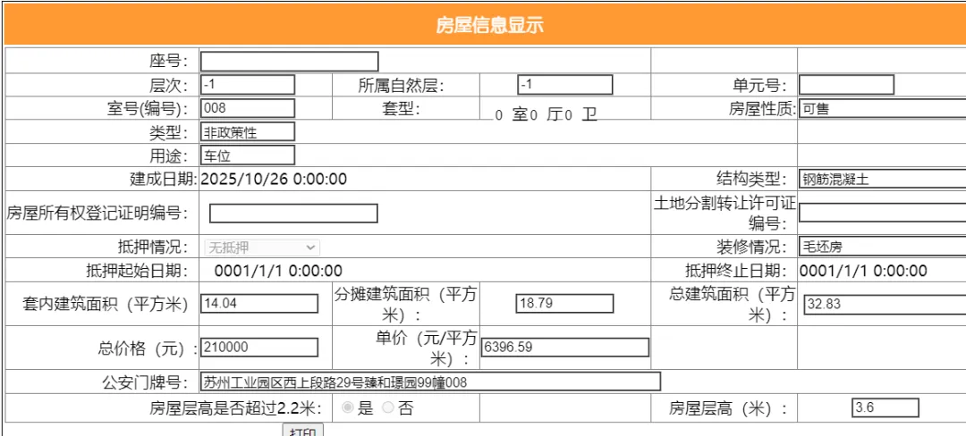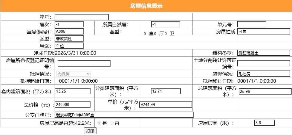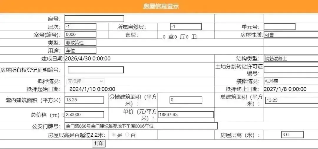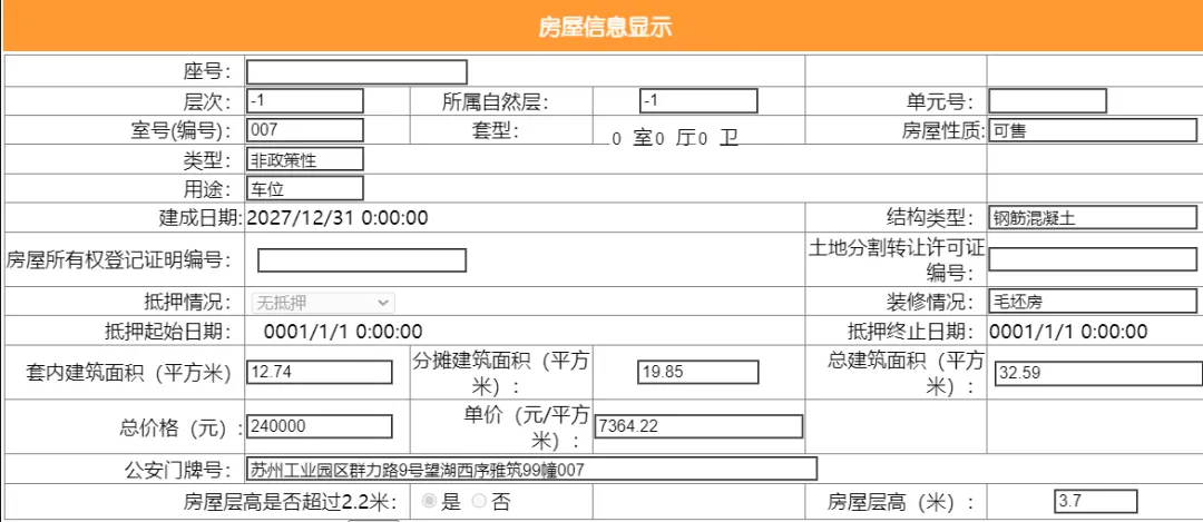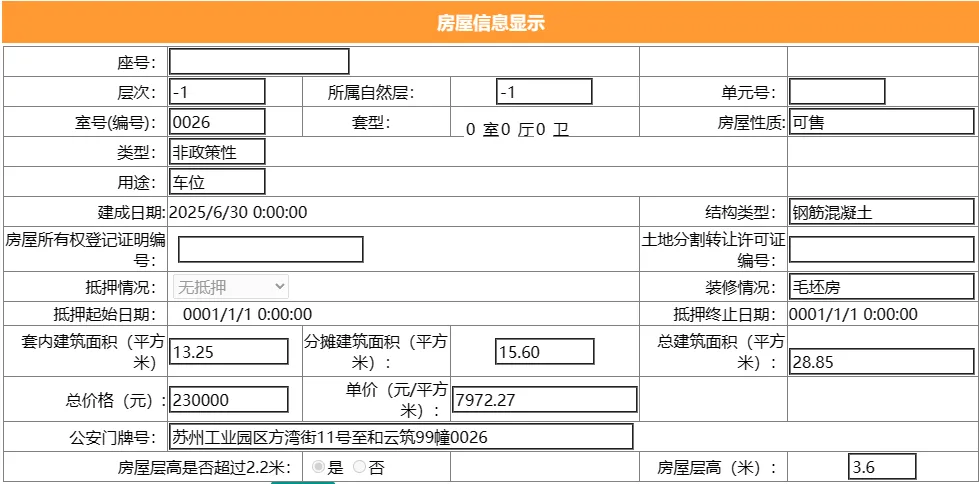其车位总建筑面积25.96平,套内建筑面积13.25平,备案均价9244.99元/平,备案总价24万元。