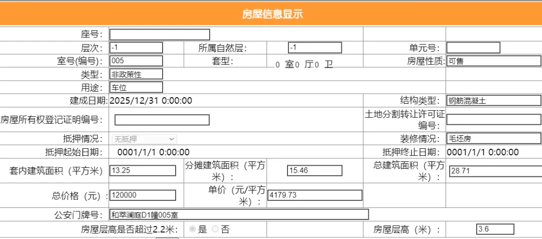 其车位总建筑面积28.71平,套内建筑面积13.25平,备案均价4179.73元/平,备案总价12万元。
