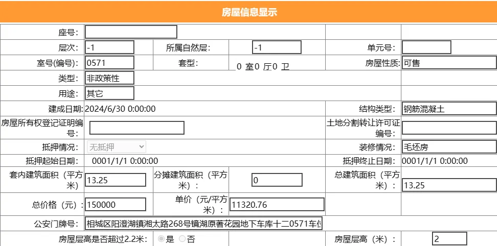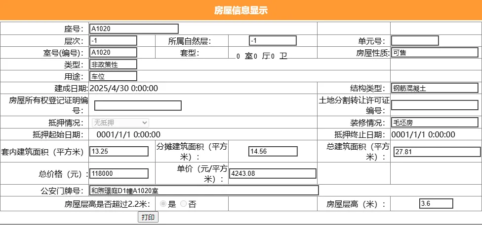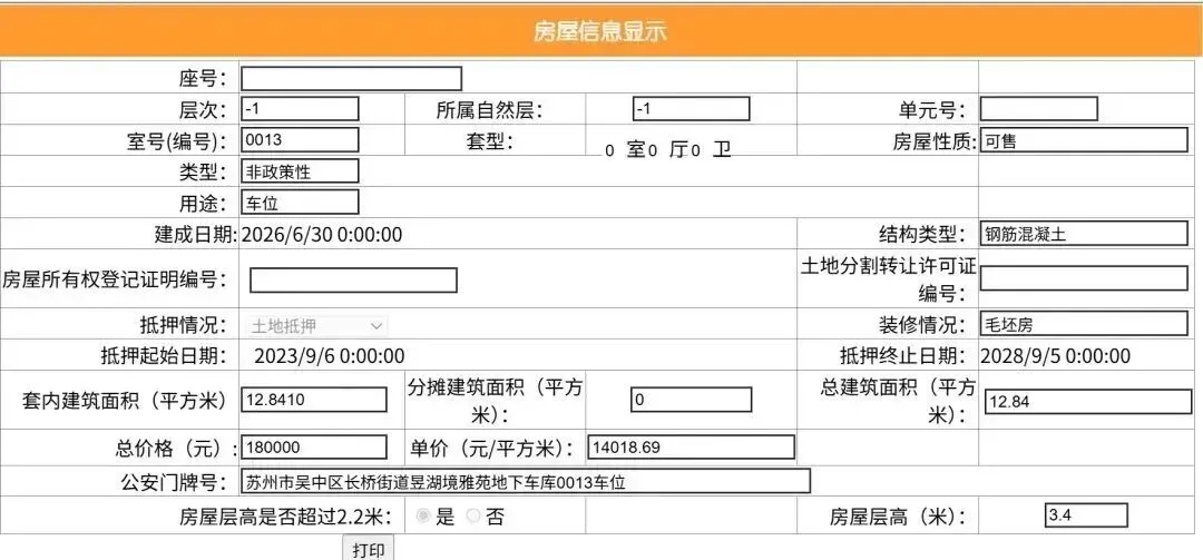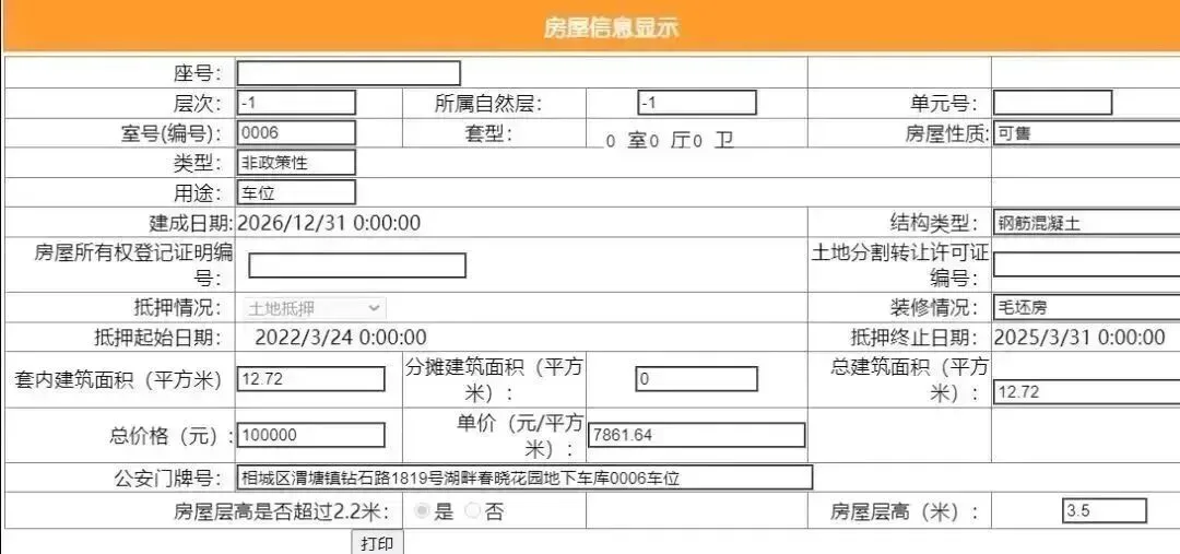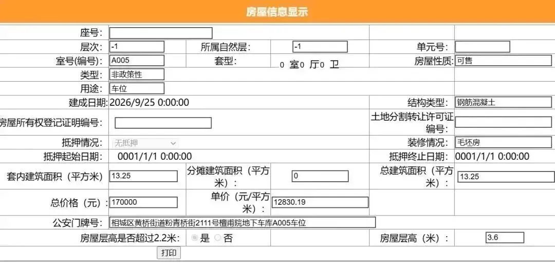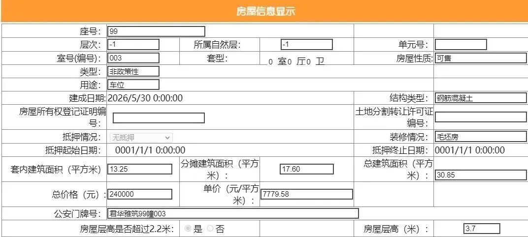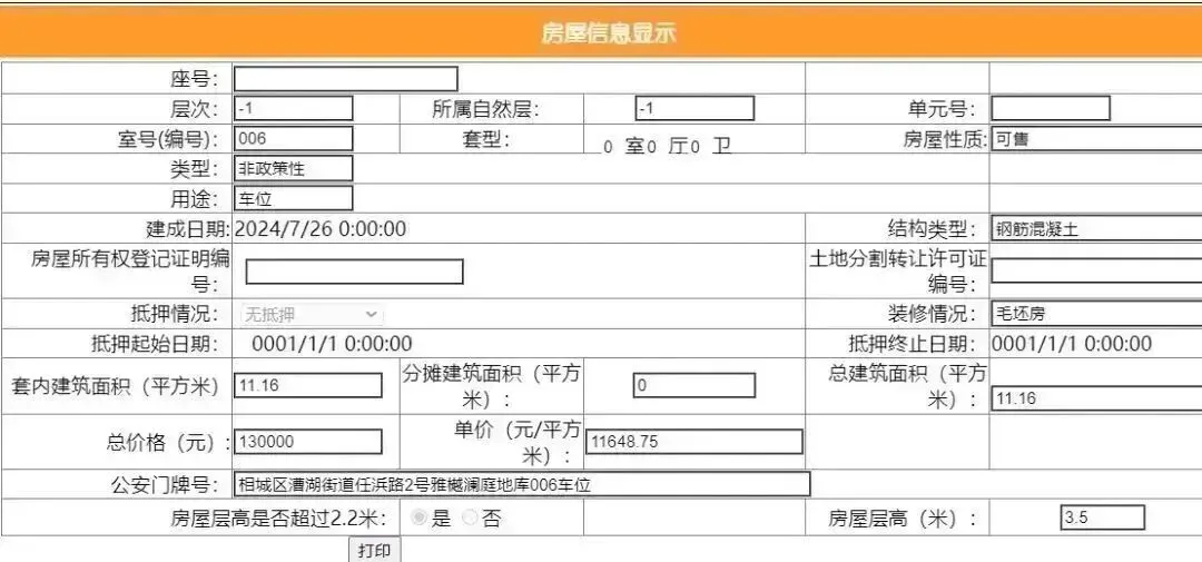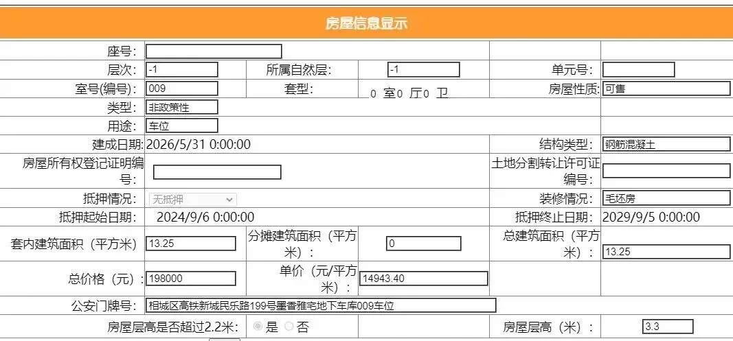 其车位总建筑面积26.52平,套内建筑面积13.25平,备案均价9049.77元/平,备案总价24万元。