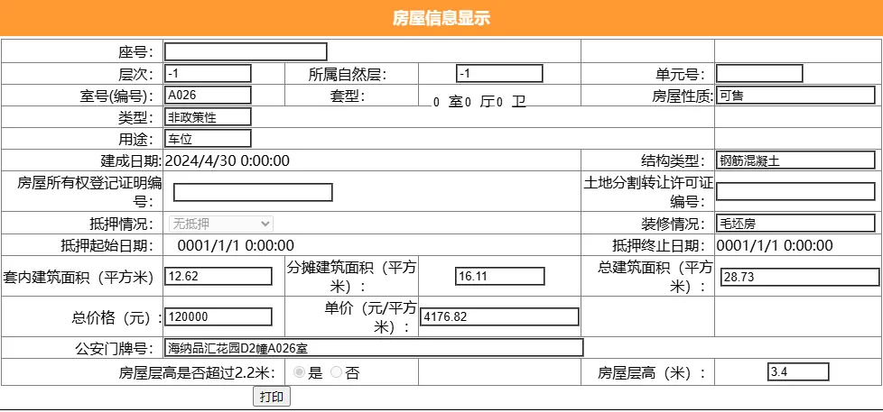 其车位总建筑面积28.73平,套内建筑面积12.62平,备案均价4176.82元/平,备案总价12万元。