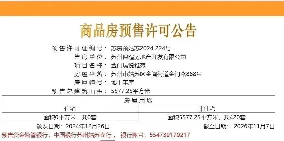 12月26日,姑苏区的保利姑苏臻悦420个车位取证!