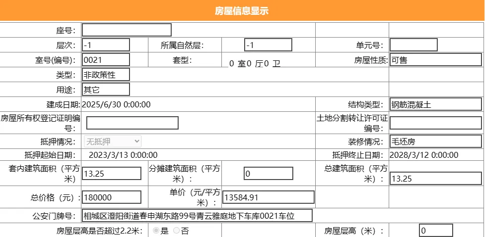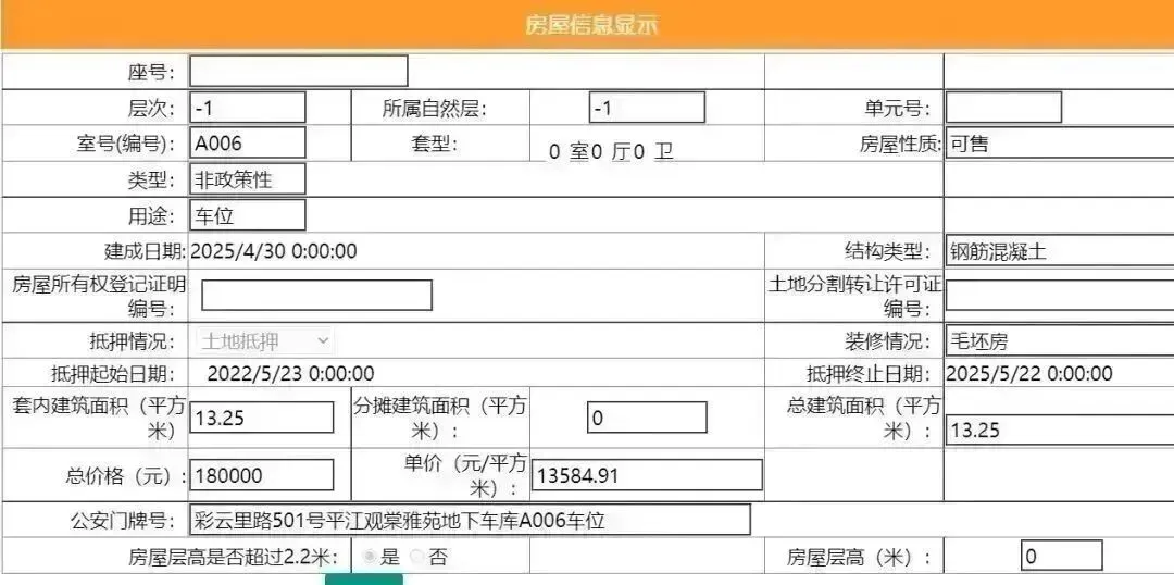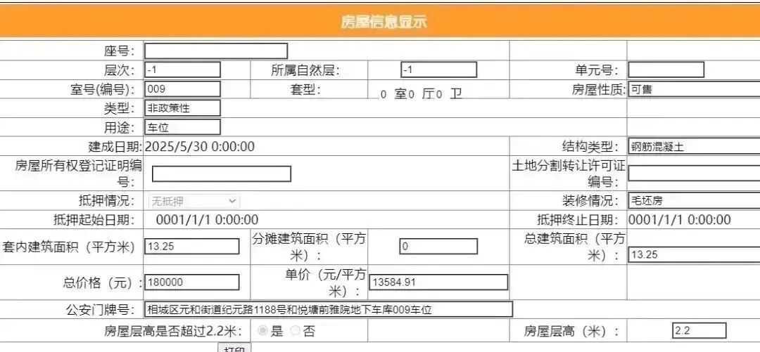 其车位总建筑面积13.25平,套内建筑面积13.25平,备案均价18867.93元/平,备案总价25万元。