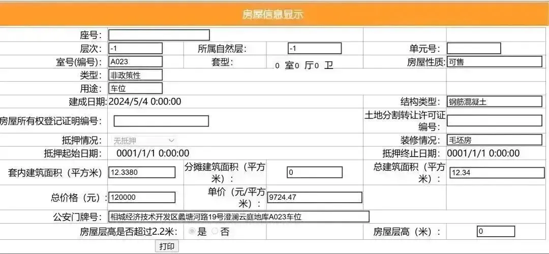 其车位总建筑面积12.34平,套内建筑面积12.338平,备案均价9724.47元/平,备案总价12万元。