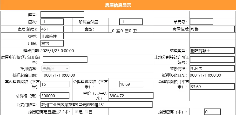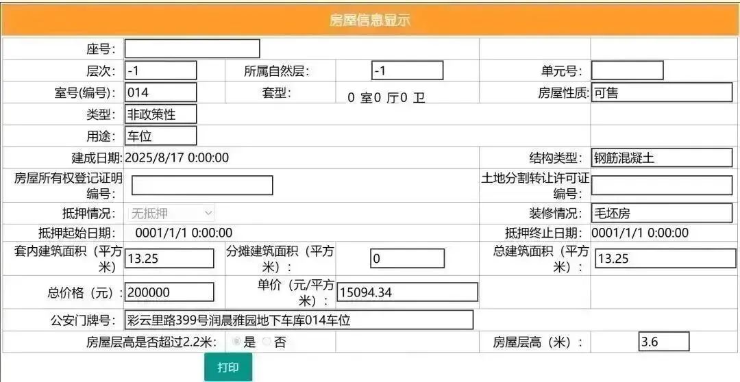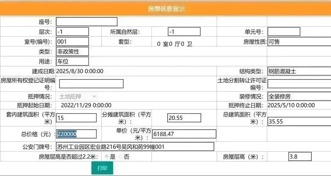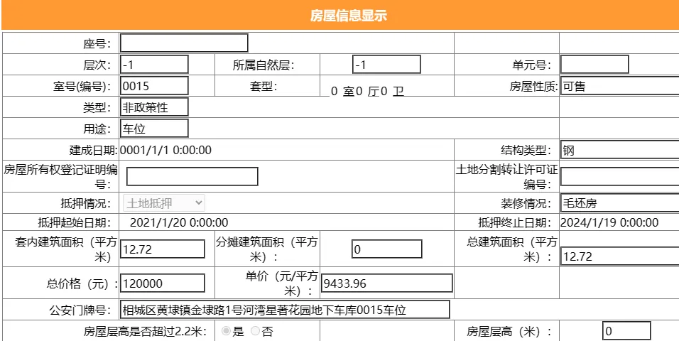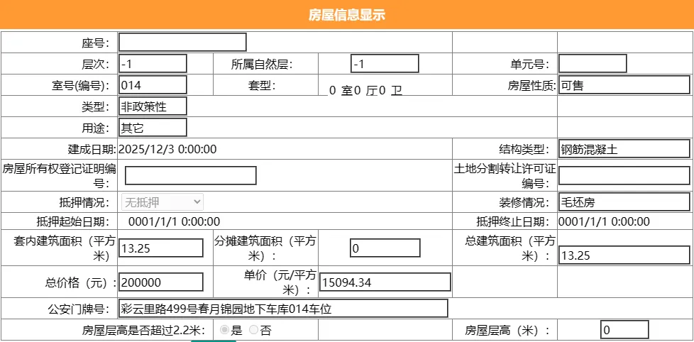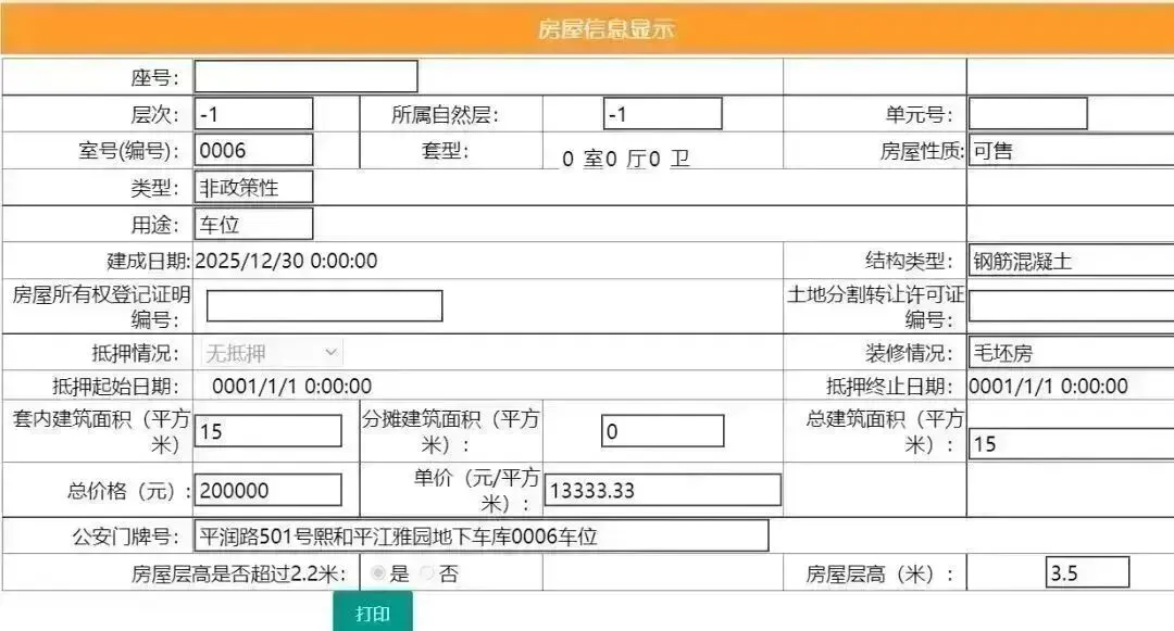 其车位总建筑面积15平,套内建筑面积15平,备案均价13333.33元/平,备案总价20万元。