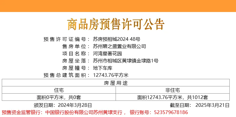 3月28日,相城区黄埭板块的河湾星著花园1012个车位取证!