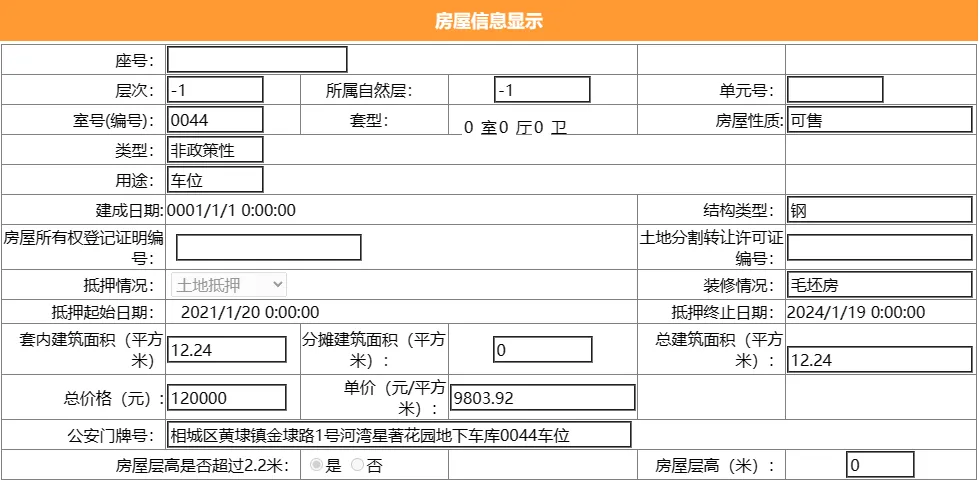 其部分车位总建筑面积12.24平,套内建筑面积12.24平,备案均价9803.92元/平,备案总价12万元。
