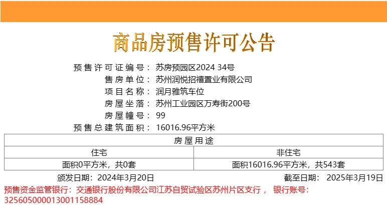 3月20日,工业园区独墅湖板块的润月雅筑543个车位取证!