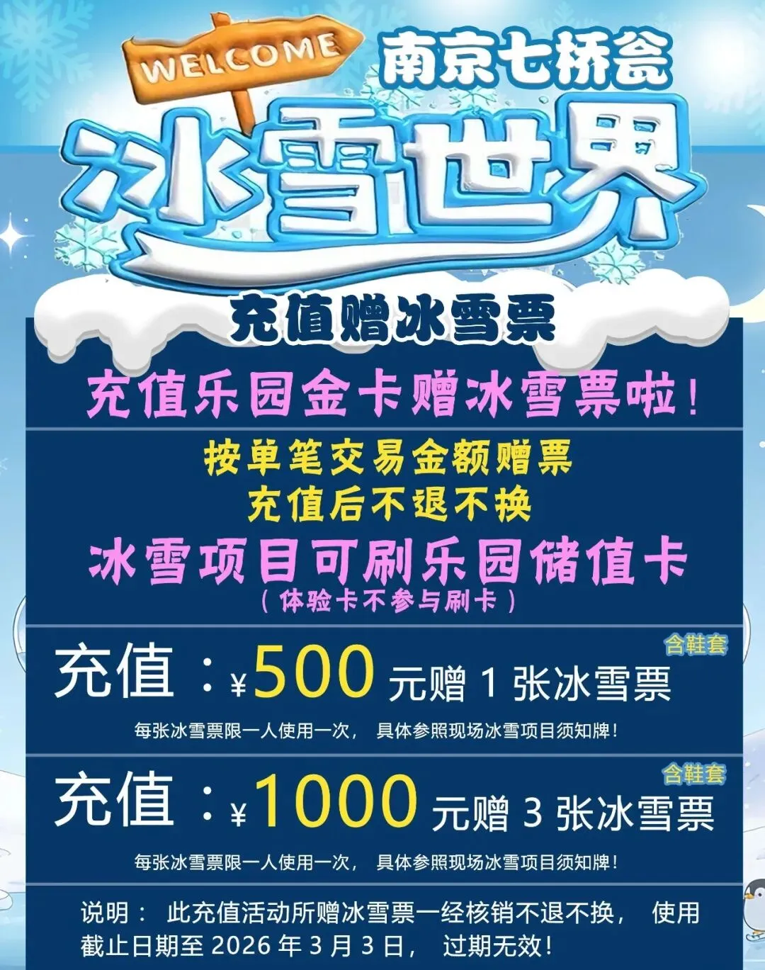 乐园充值卡充值赠送冰雪票,单笔赠票数量不超过三张;