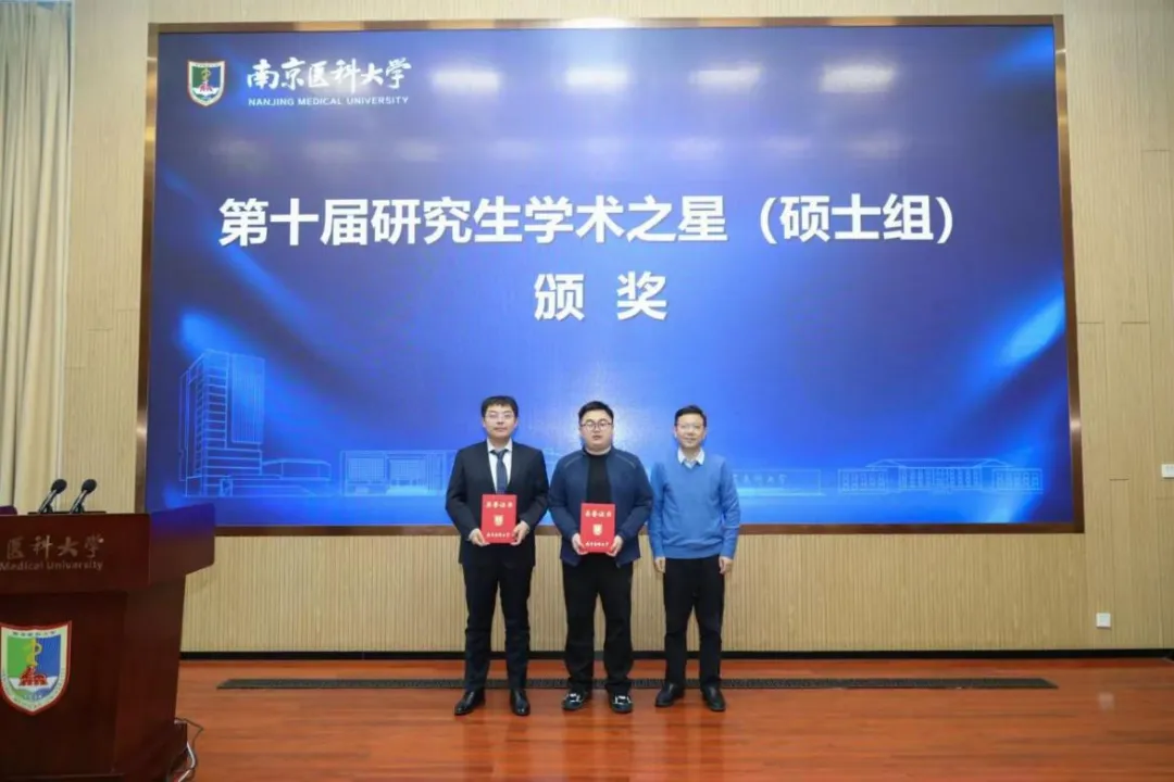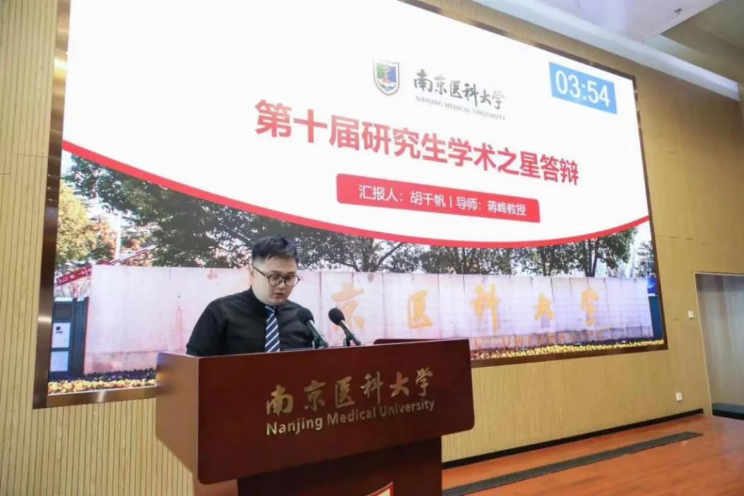决赛现场,胡千帆与来自第一临床医学院、公共卫生学院、基础医学院等全校各院系的 15 位优秀硕士选手一同登台竞技,开展了一场精彩纷呈的现场答辩。凭借深厚扎实的科研功底,最终荣获南京医科大学第十届“学术之星”(硕士组)第三名的优异成绩。其导师蒋峰教授更是连续两届荣膺“学术之星”优秀指导教师称号,充分彰显了我院师生在科研领域的拼搏精神与卓越风采。