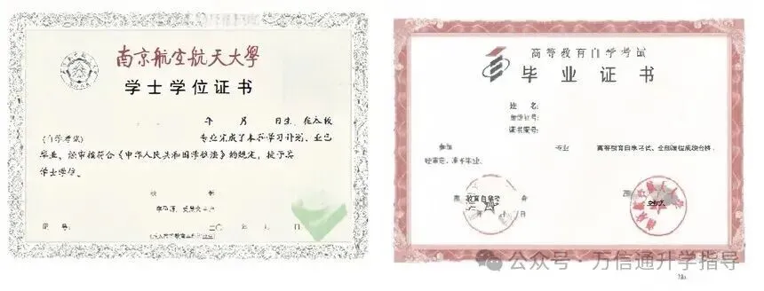 学生完成考试计划规定的全部课程(含实践性环节考核和毕业论文等)且成绩合格后,按有关规定对其进行思想品德鉴定。符合毕业条件者由江苏省教育考试院发给相应层次的自学考试毕业证书,南京航空航天大学附署,并在国家教育部网站上注册。本科毕业生符合我校高等教育自学考试毕业生学士学位授予条件者,授予相应学士学位。