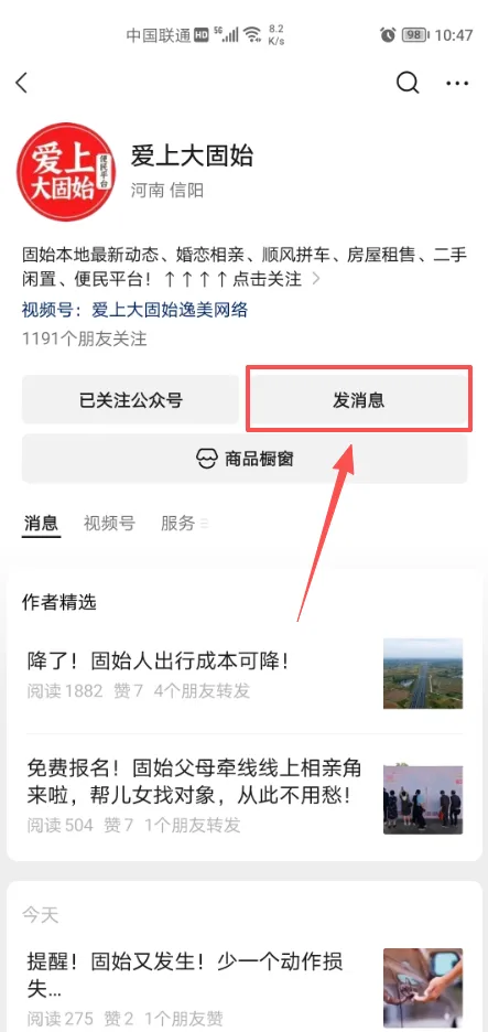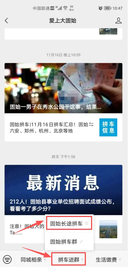 点击进入爱上大固始微信公众号,点击发消息,找到底部菜单栏“固始拼车”,点击进入。