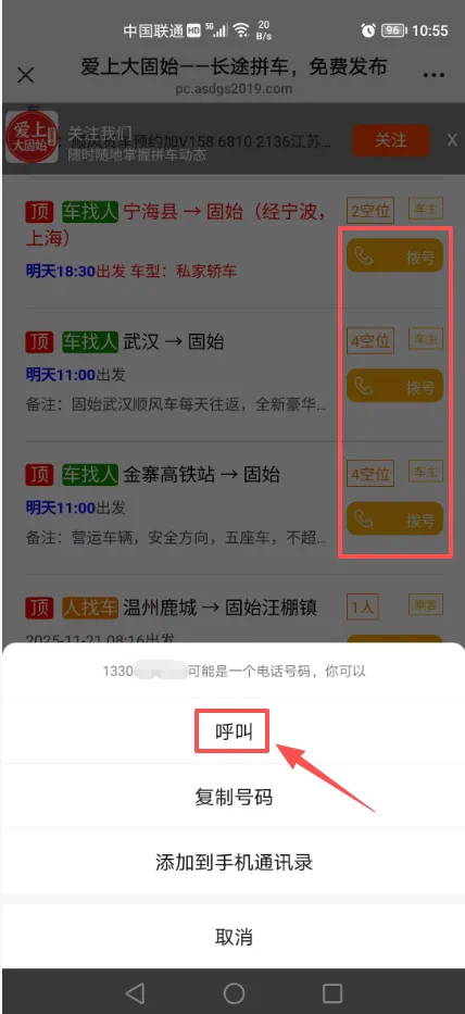 进入拼车平台后,输入你的出发地和目的地进行查询,查询到合适信息后点击“拨号”与发布人进行联系。
