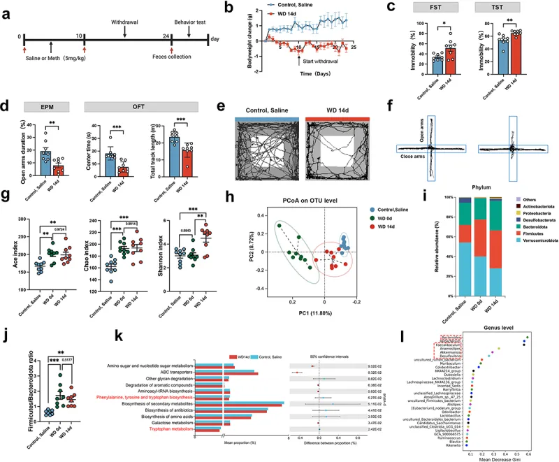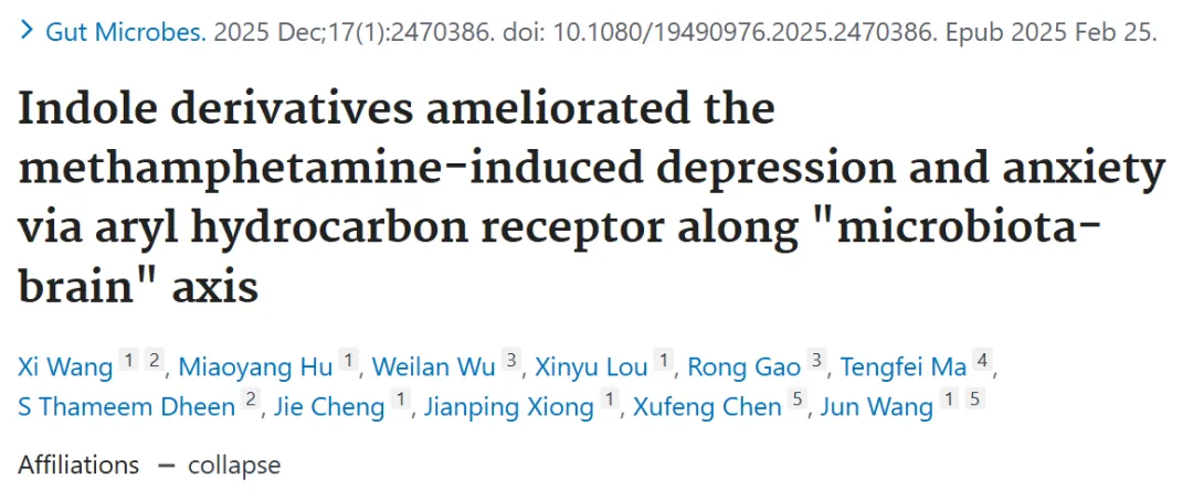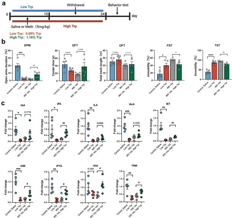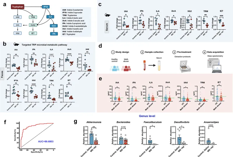 针对甲基苯丙胺(Meth)诱导的抑郁和焦虑症,现有研究多聚焦中枢神经系统(CNS),而鲜有尝试从外周系统揭示其心理障碍的细胞学基础。肠道作为“第二大脑”,其与菌群的相互作用通过神经、内分泌、免疫及代谢通路参与CNS活动(包括情绪、应激反应和认知功能)。因此,靶向肠道菌群治疗心理障碍可能是一种颇具前景的治疗策略。肠-脑轴是一个复杂的双向通信网络,将肠道菌群与CNS联系起来。色氨酸(TRP)作为九种必需氨基酸之一,在协调胃肠道功能和CNS活动中起着关键作用。TRP主要通过三条代谢通路:犬尿氨酸通路、血清素通路和微生物代谢通路(吲哚代谢通路)。在微生物代谢途径,肠道菌群将TRP代谢为多种吲哚衍生物,如吲哚-3-甲醛(IAld)、吲哚-3-乙酸(IAA)、吲哚-3-丙酸(IPA)、吲哚-3-丙酮酸(IPYA)等。由于吲哚及其衍生物被确认为菌群-肠-脑轴中的关键信号分子,能够影响大脑功能和行为,TRP微生物代谢途径越来越受到关注。在抑郁症患者中,吲哚及其衍生物的水平已被证明与抑郁和焦虑症状的严重程度密切相关。然而,到目前为止,菌群及其相应代谢物是否参与了甲基苯丙胺诱导的抑郁和焦虑,仍然知之甚少。