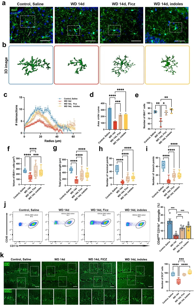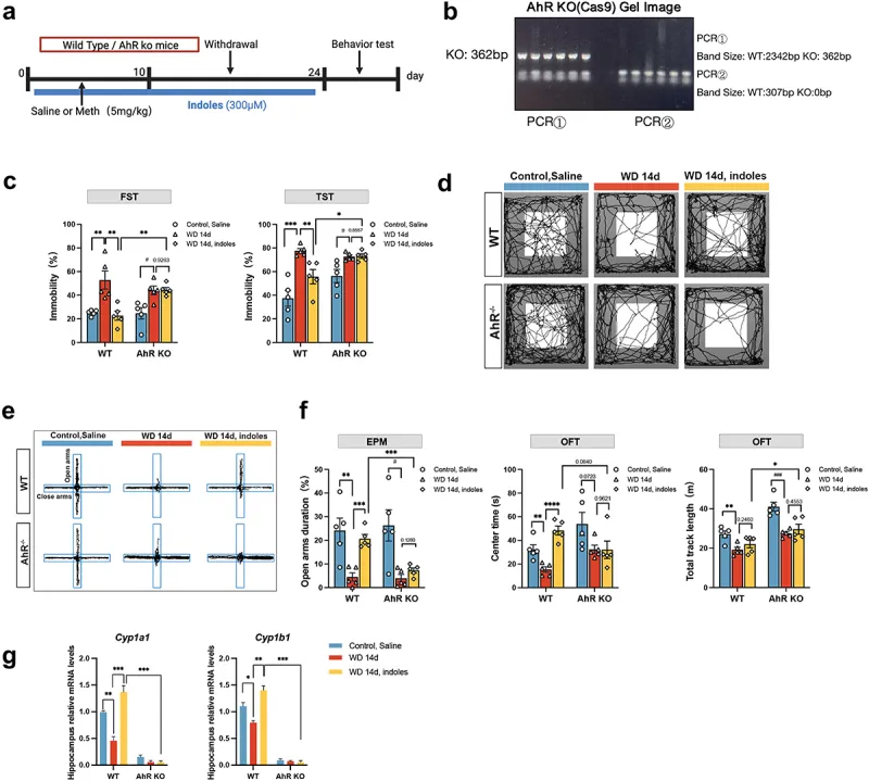 芳香烃受体(AhR)是一种在免疫细胞、小胶质细胞、肠上皮细胞等细胞中表达的转录因子,可被来自饮食、微生物代谢物以及环境污染物中的特定小分子激活。AhR与其配体结合后,易位至细胞核并与芳香烃受体核转位蛋白(ARNT)形成异源二聚体,进而调控细胞色素P450家族成员CYP1A1、CYP1A2和CYP1B1的表达,这对于吲哚及其衍生物的降解至关重要。已有研究表明,无论在体内和体外,吲哚均具有神经保护的作用。然而,吲哚代谢通路是否参与Meth诱导的抑郁症和焦虑症仍不明确。因此,阐明吲哚衍生物及AhR信号在Meth诱导的神经行为改变中的作用具有重要意义。