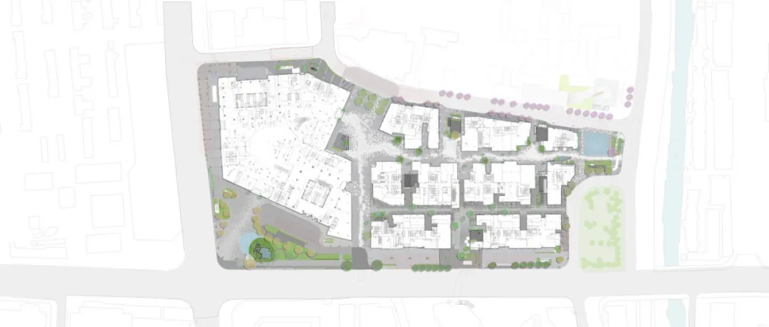 项目所处的城市环境具有高度复合性:周边汇聚了 H+ 美术馆、苏州市第五中学、丽思卡尔顿酒店、万豪公寓、石路商业街以及成熟住宅区。