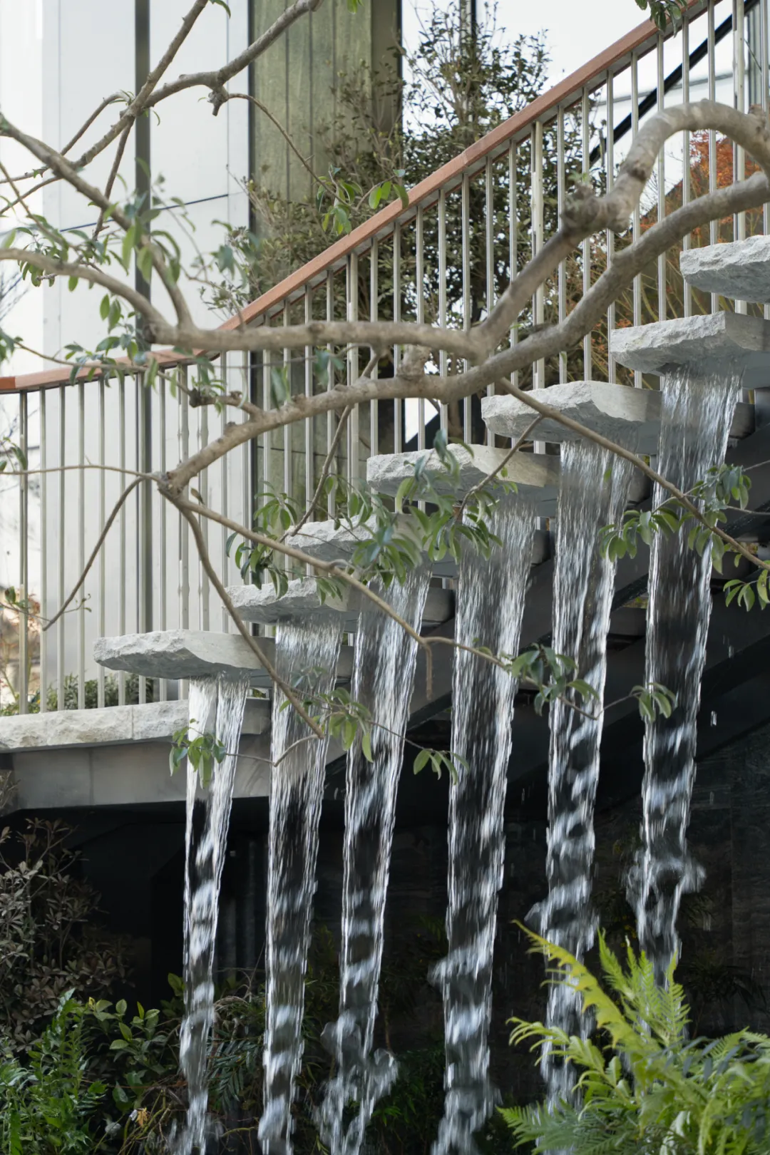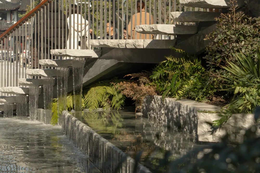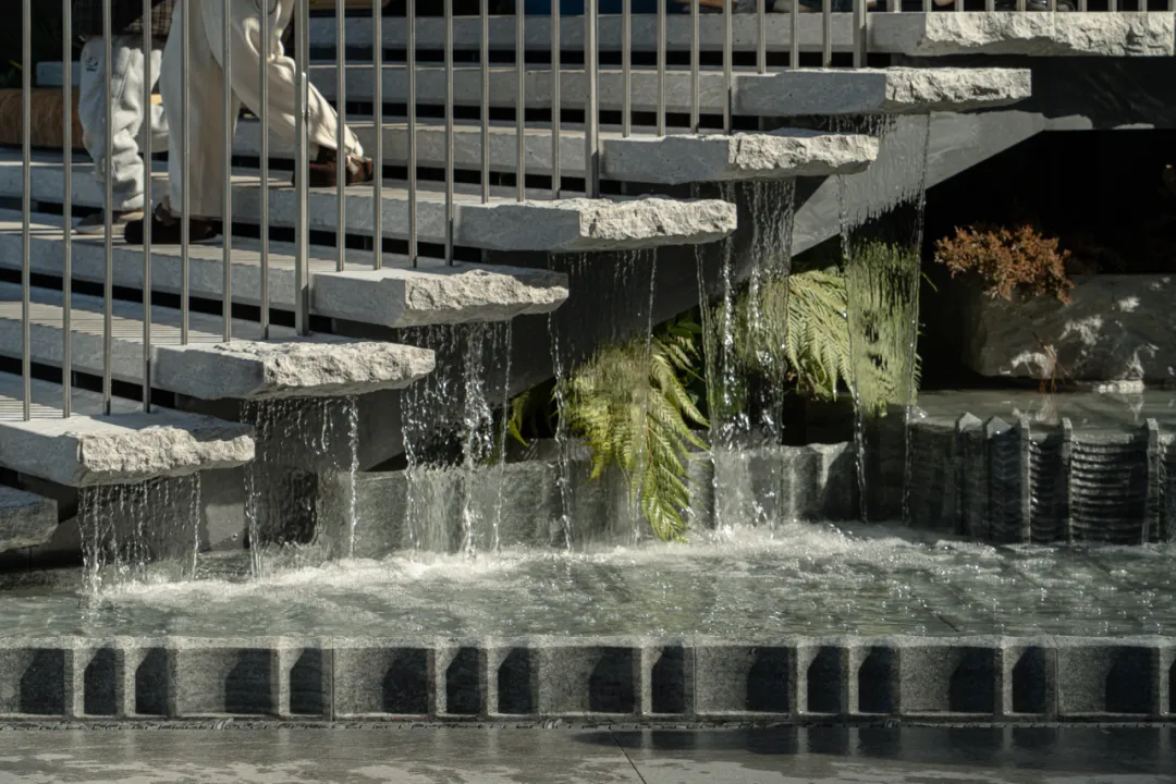 台阶下方设置落水,水沿石面自然跌落,模拟的是苏州山塘河雨天时的状态——水不急、不响,却持续存在。