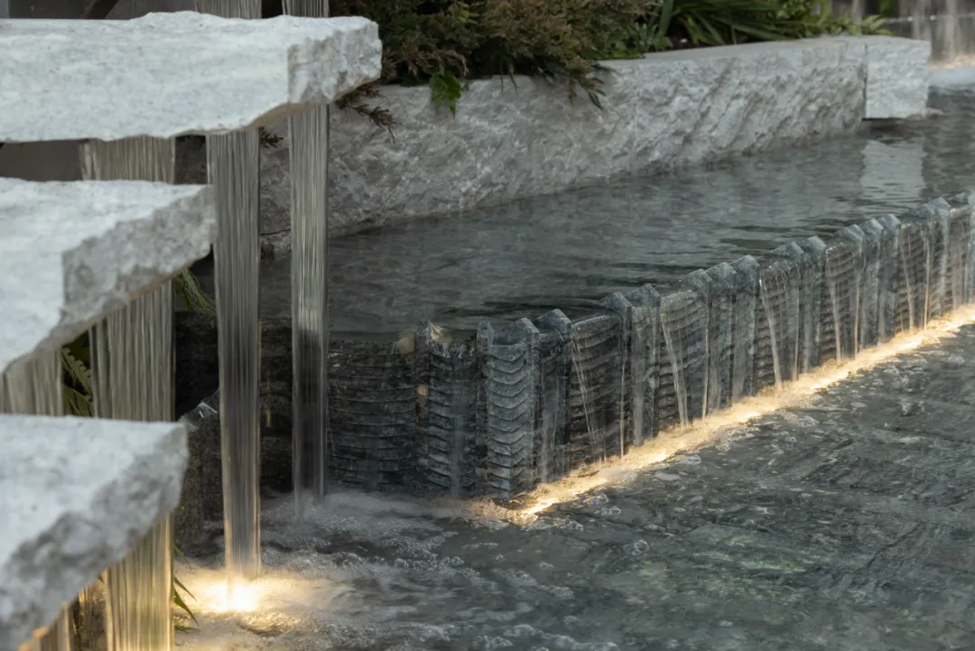 石头与琉璃成为主要媒介:石材承载重量与秩序,琉璃则引入光感与通透性。当水流经过这些不同材质的表面,速度、声音与反射方式随之变化,形成层次丰富却不张扬的水景体验。
