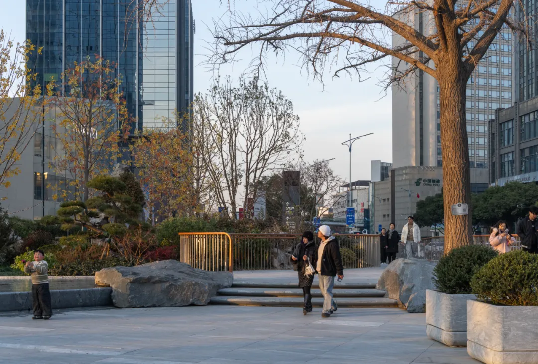 注:项目景观设计曾推进至上一轮开发完成;在延续既有空间范围的前提下,仅保留原设计的广济路,金门路一侧外街界面及第五中学前人行道铺装。其余景观范围,包含(艺文广场/时光广场/银杏广场/里巷广场/高街水景/里巷水景/高街/里巷...)等核心景观区域内容均由我司自概念阶段起重新设计,并完整实施落地。