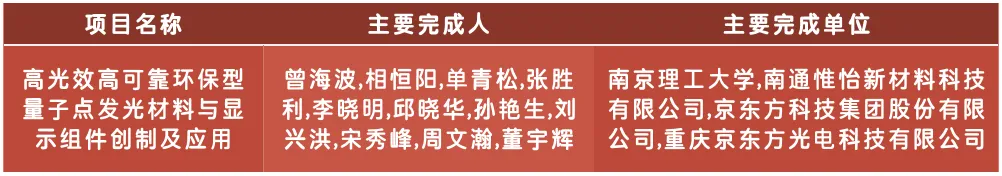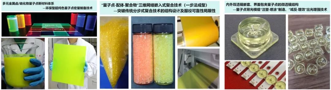 成果简介:无机半导体量子点,因其显著的量子效应、可调且纯色的发光,而被授予2023年诺贝尔奖,是推动新一轮“广色域、高光效、轻薄柔”显示技术变革的源头。针对量子点显示的重大需求与挑战,该成果聚焦量子点“材料-复合-组件”关键技术链,突破环保化、可靠性、光效难题,创制了环保型量子点新材料,开发了高光效高可靠量子点背光透镜、背光膜等4型7类量子点显示产品。其中,双球叠套量子点透镜属国际首创,量子点合成与复合技术达国际领先水平,经济、环境及社会效益显著,推动了行业科技进步。
