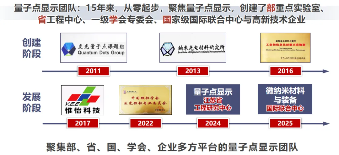 量子点显示团队简介:南京理工大学量子点显示团队,依托新型显示材料与器件工信部重点实验室、江苏省量子点显示工程研究中心开展量子点显示“发光、驱动、应用”全链条研究。团队负责人,曾海波教授,南京理工大学材料科学与工程学院院长,国家杰出青年基金获得者,国家“万人计划”领军人才,国家“重点研发计划”首席科学家。长期从事量子点显示发光与驱动研究,包括低维半导体理论、发光量子点与QLED、二维半导体与TFT驱动、显示技术与应用,主持国家重点研发项目、国家973计划课题,基金委杰青、优青、重点等20余项,发表Nature Materials、Nature Photonics、Nature Electronics等子刊18篇、Advance Materials 40余篇,他引55000余次,单篇超过1000次10篇,最高3000余次,H因子113,连续9年入选“全球高被引科学家”。获授权发明专利45项、PCT专利3项、国家标准2项,成果转化形成“惟怡-量子点(VEQD)”等新型显示产品,孵化国家级“高新技术企业”1个(南通唯怡)。以第一完成人获2024年江苏省科技进步奖一等奖、2022年江苏省科技一等奖、2023年中国材料研究学会科技一等奖、2023年国家级教学成果二等奖。