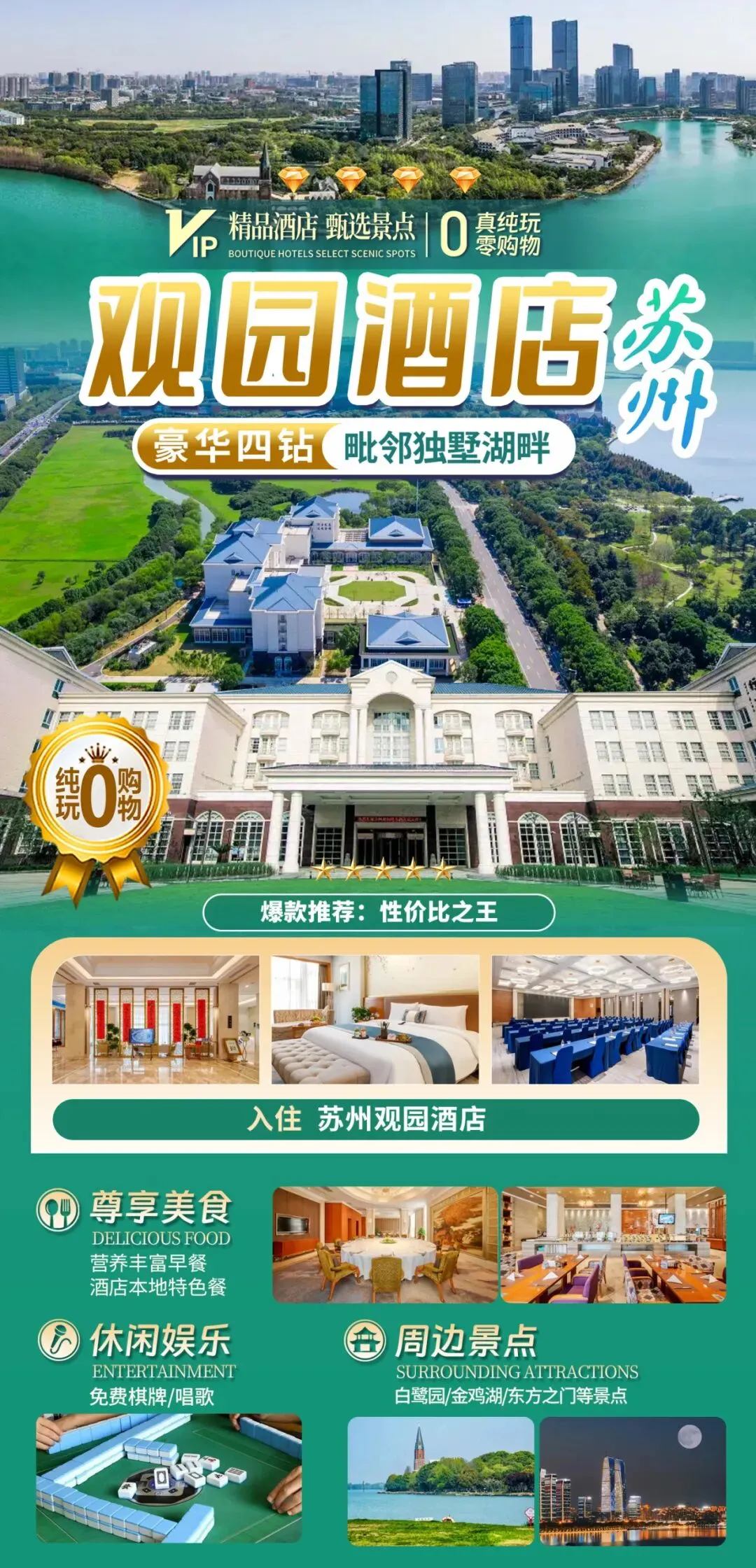 当前位置:首页>苏州>苏州◆金鸡湖/独墅湖畔◆豪华四钻【苏州观园酒店】3天2晚◆2豪华自助早餐4正餐◆免费棋牌/唱歌◆周边游白鹭园/金鸡湖D