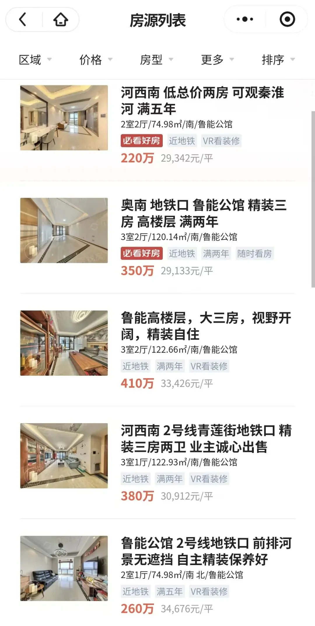 ·较河西南核心(4万+)有 25%+ 价差,但地铁距离(200m 青莲街站)、装标(地暖+中央空调)、物业(鲁能央企)不输甚至反超。