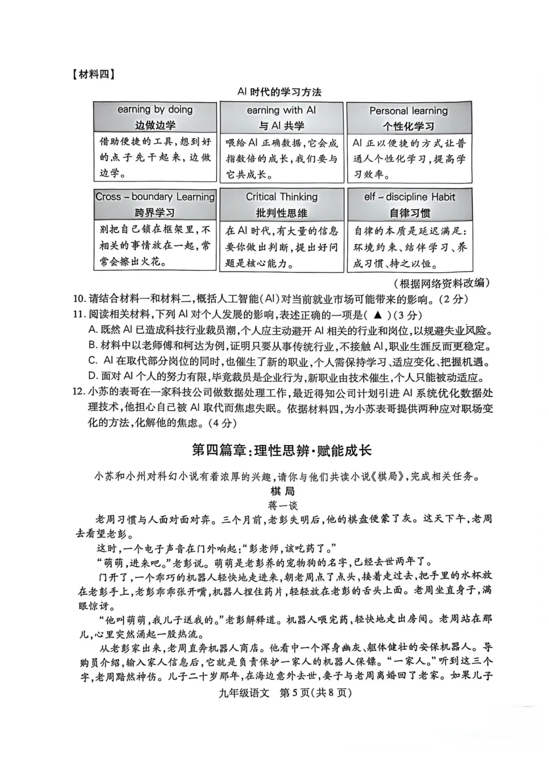 上午第一场考试语文,整张卷子主题是AI,作文考的是《我的AI伙伴——》或续写阅读的《棋局》。