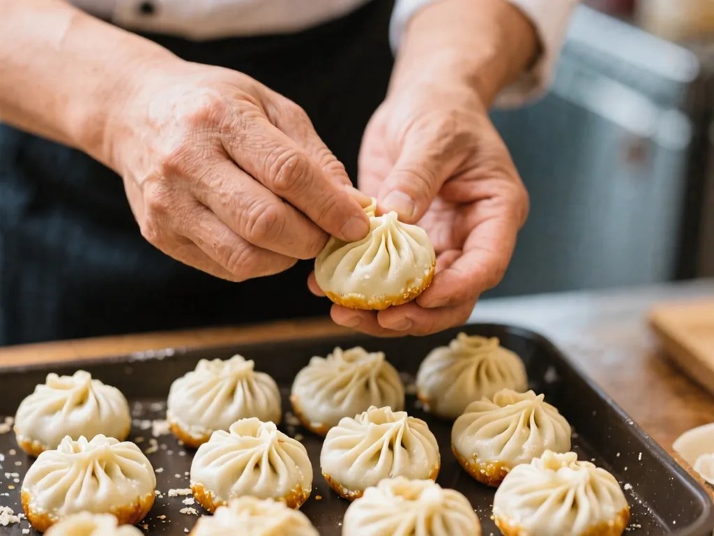 包制也有讲究,取25克左右面团擀成中间厚边缘薄的圆皮,包入30克带皮冻的馅料。收口要捏出16道以上的细密菊花褶,还要把褶子朝下放锅里,既能保证美观,还能让底部平整受热,煎出完美的焦脆面。