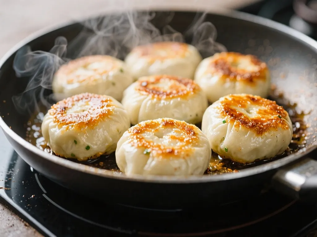煎制是给生煎注入灵魂的最后一步,全程得精准把控。先把平底锅烧热刷油,生煎褶子朝下码整齐,中小火慢煎到底部微黄定型,锁住肉馅鲜汁。接着沿锅边淋入1:10的稀面粉水,水量到生煎高度1/3,加盖转大火用蒸汽焖熟内部,让底部形成酥脆层。等水快干时揭盖转小火煎2分钟,烤干底部水分,煎出金黄焦脆的纹路,出锅前撒葱花芝麻提香。