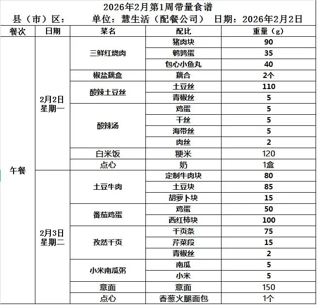 徐州市梅园小学带量食谱公示(2026.02.02~2026.02.03)