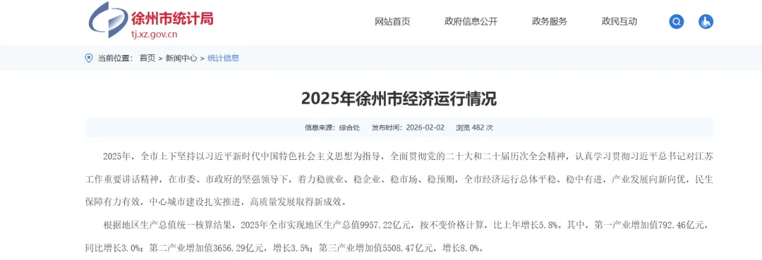 2026年2月2日,徐州市统计局发布《2025年徐州市经济运行情况》:根据地区生产总值统一核算结果,2025年全市实现地区生产总值9957.22亿元,按不变价格计算,比上年增长5.8%。其中,第一产业增加值792.46亿元,同比增长3.0%;第二产业增加值3656.29亿元,增长3.5%;第三产业增加值5508.47亿元,增长8.0%。