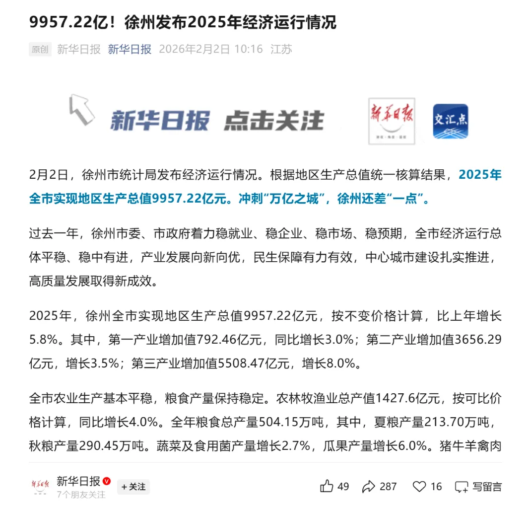 2月的第二天,徐州统计局终于官宣,徐州2025年GDP未破万亿,还差一点点!
