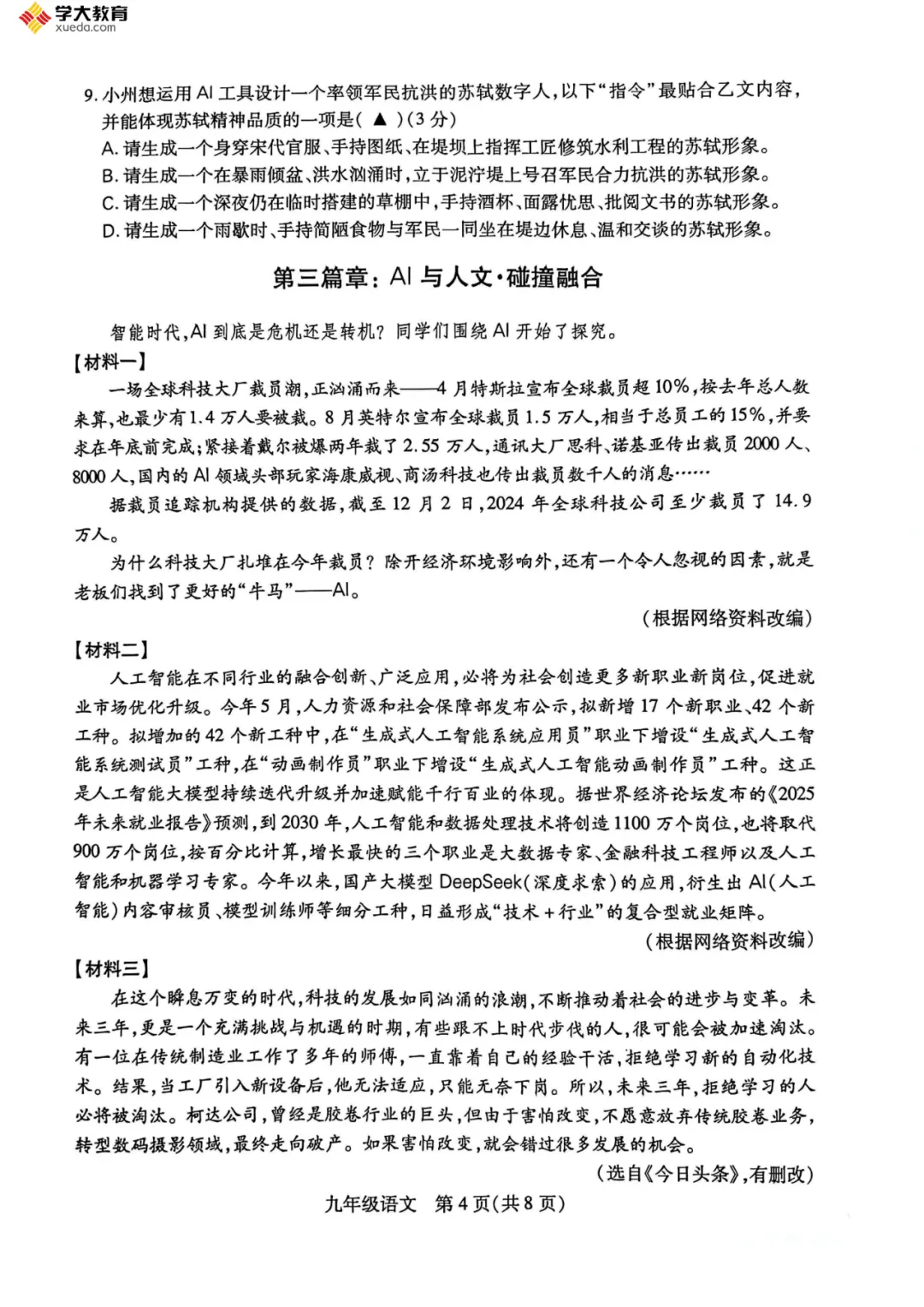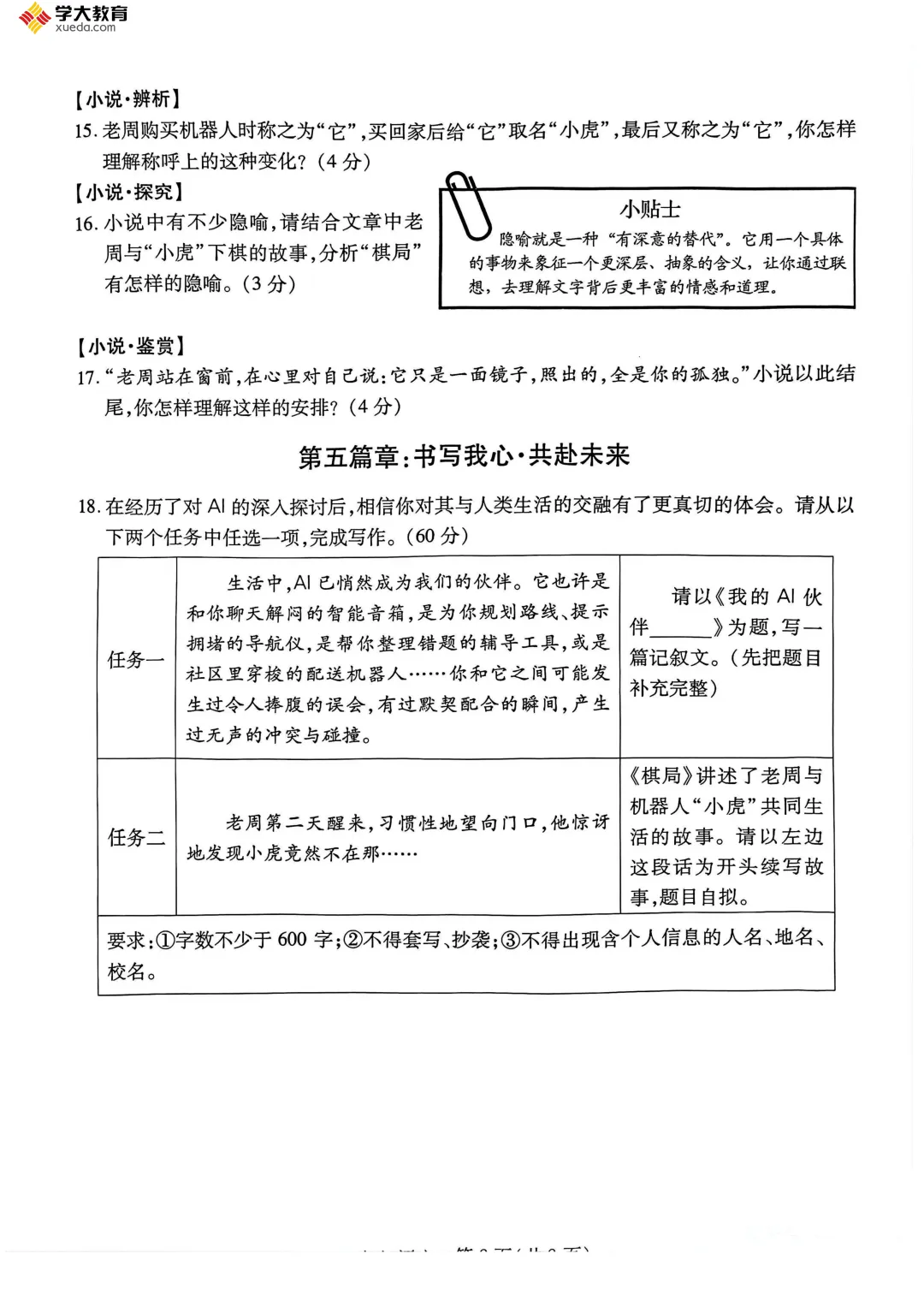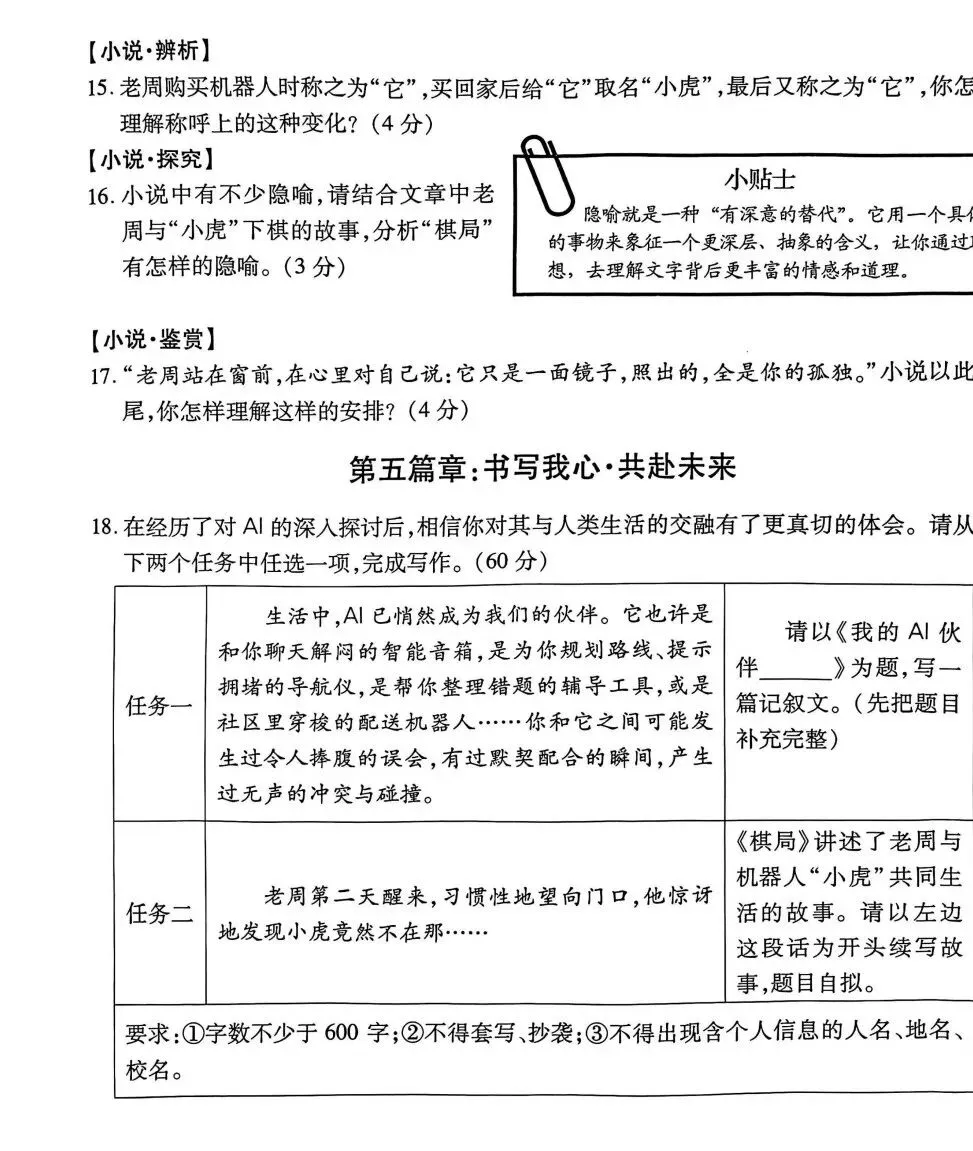 上午第一场考试语文,整张卷子主题是AI,作文考的是《我的AI伙伴——》或续写阅读的《棋局》。