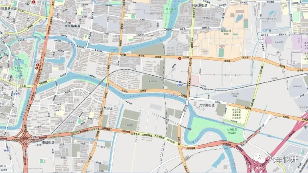 从OpenStreetMap上看宁铜铁路(宁芜铁路)光华门站的位置。截屏于2022年10月7日