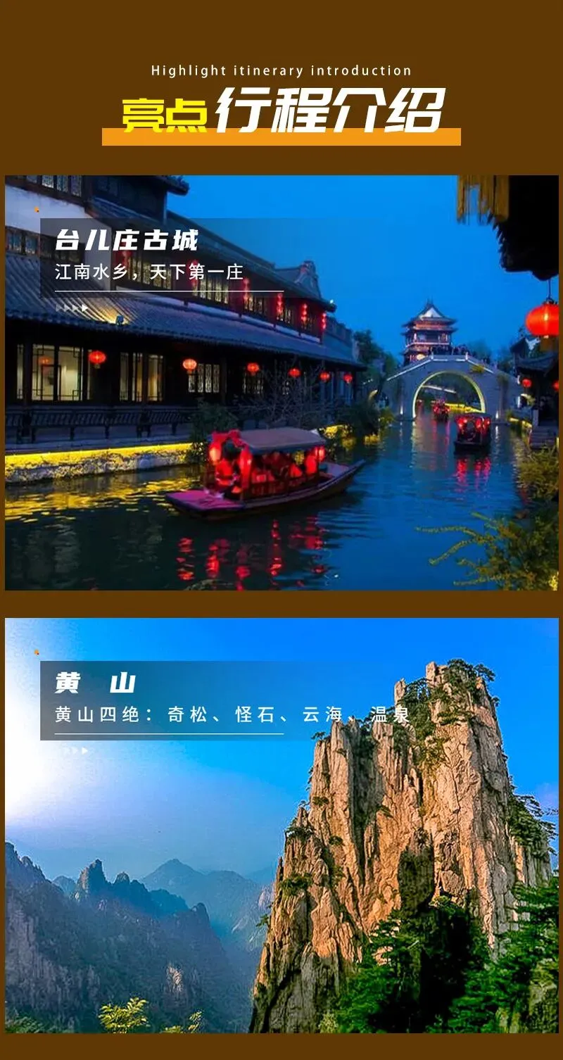 2)门票:台儿庄古城团体110元,黄山门票自行预约2.21日最早时间段,宏村团体93元(门市104元),木坑竹海团体35元(门市40元),阳产土楼门票+小交通30元;以上费用供参考,以景区规定为准。以上门票供参考,以景区当天实际为准。