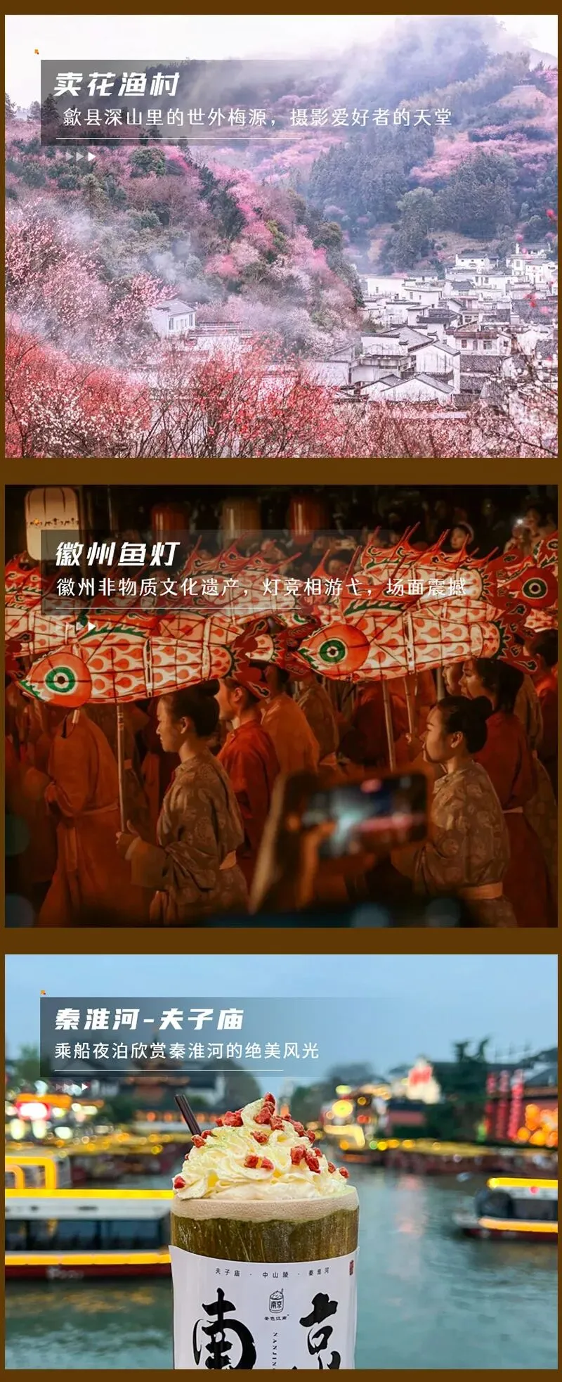 - 适时集合我们前往『徽州古城』游览。这个假期,来徽州古城赴一场鱼灯之约吧!漫步青石板路,看八脚牌坊诉说沧桑,听茶歌小剧场演绎千年故事。当夜色降临,红鳞白身的鱼灯在巷弄游弋,光影流转间,古徽州的繁华与浪漫在此刻绽放。古城的喜庆氛围笼罩在每一盏灯笼上,流动在每一场盛大的鱼灯巡游中!