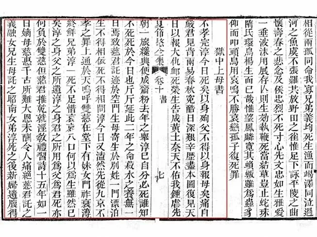 陈子龙的爱徒、神童诗人夏完淳(1631~1647),更是一名杰出的少年爱国英雄。他14岁就参加抗清活动,写了大量的爱国诗文。《即事》《送客金陵》《柬半村先生》《狱中上母书》《采桑子》等诗文,表现了作者不屈不挠的民族气节、视死如归的斗争精神和才华横溢的形象。《狱中上母书》近700字,是夏完淳在狱中用辞赋语言写给他母亲的一封家书。综观全篇文字,悲壮凄婉、血泪交融,从亲属之情到民族之恨,从杀父之仇到亡国之痛,既有绵绵无尽之恨意,又有男儿凌云之壮志。
