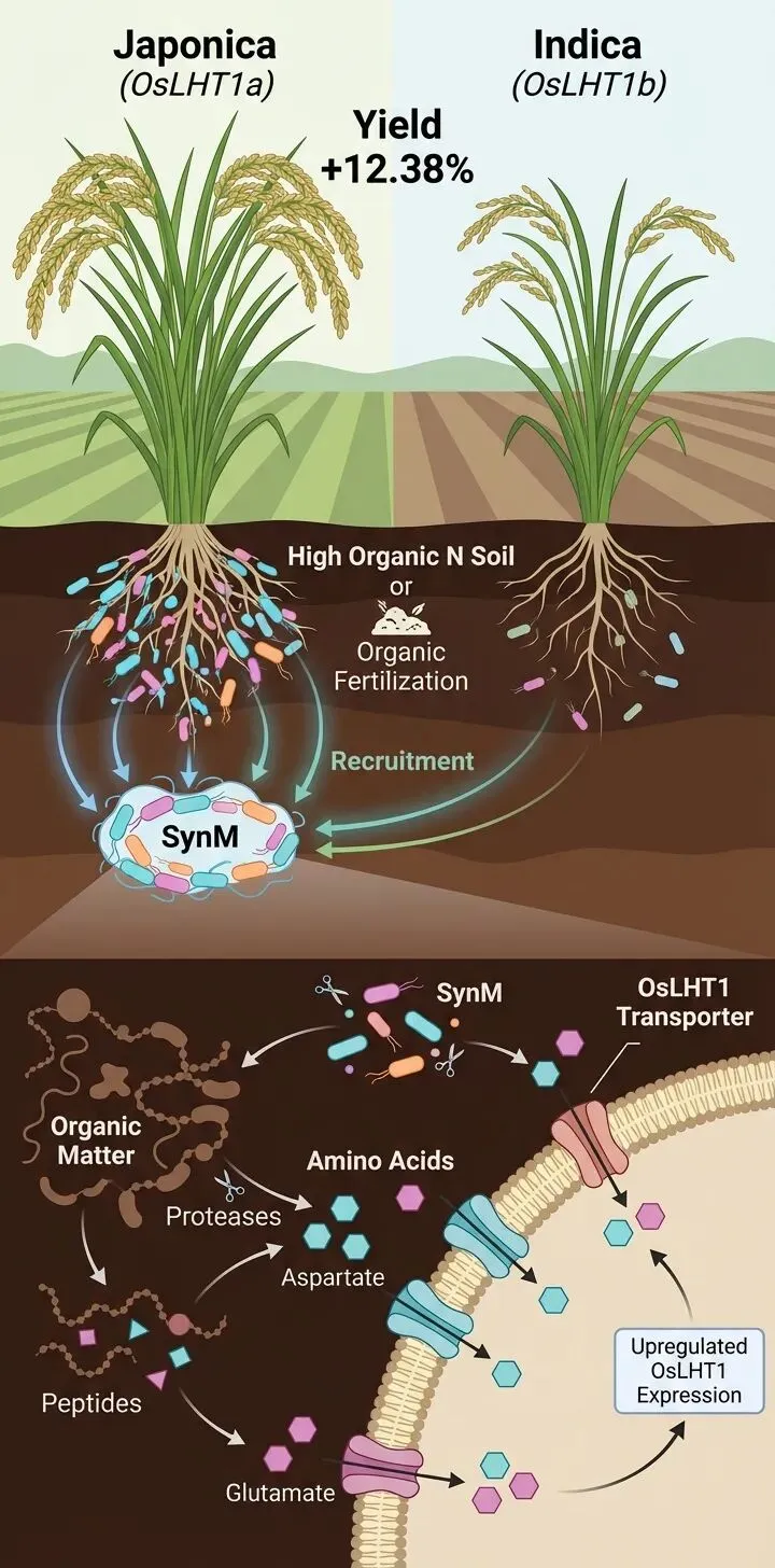 为了确认OsLHT1基因在其中的核心作用,团队利用基因编辑技术创制了OsLHT1功能缺失的突变体。在有机肥土壤中,野生型和杂合型水稻接种SynM后,株高、氨基酸和总氮积累均显著提升,而突变体则几乎没有任何响应。根际微生物群落分析显示,SynM在野生型和杂合型根际的定植丰度远高于突变体。然而,在化肥土壤中,所有基因型对SynM的响应都微乎其微。这表明,OsLHT1基因的功能是SynM发挥有益作用的前提,而有机肥提供的环境则是这一互作得以实现的“土壤”。